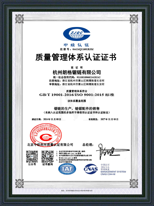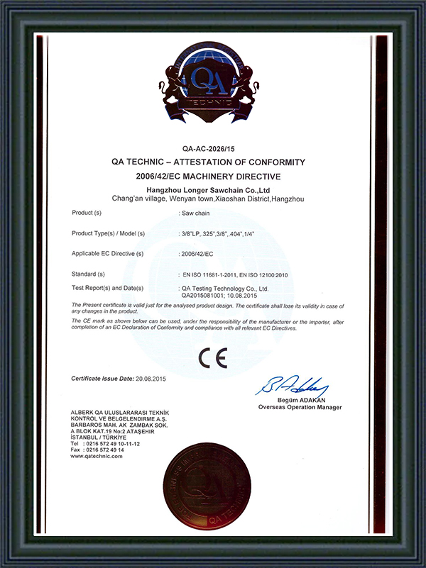 2012年伊始,自主研发了全自动锯链装配设备,成为国内拥有自动化锯链装配线的企业之一,主要原材料从德国进口,与斯蒂尔的材料为同一供应商,先进的工艺,稳定的材料、严格的品质管控与不断提升的产品质量使公司产品深受国内外客户认可与信赖。成立至今,产品远销美洲、欧洲、澳洲、亚洲等50多个国家。朗格已通过ISO9001质量体系认证及 CE 、UL、CUL等国际认证。